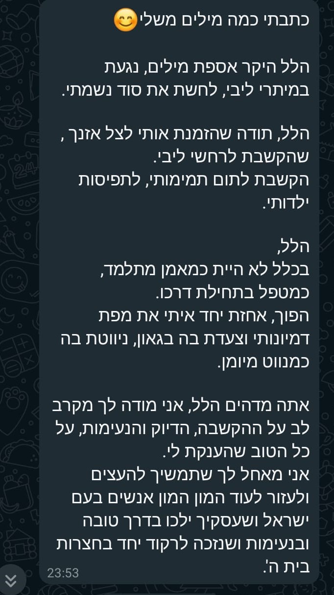 שמי הלל אייזן, בן 28 נשוי ואב לשתי בנות. גר במושב כרמל ומלמד בישיבת רעותא. למדתי וסייעתי בהוראת הקורסים של מכון דמיון נובע, ומאז זכיתי להנחות תהליכים רבים, מרגשים, מחדשים ומגדלים.